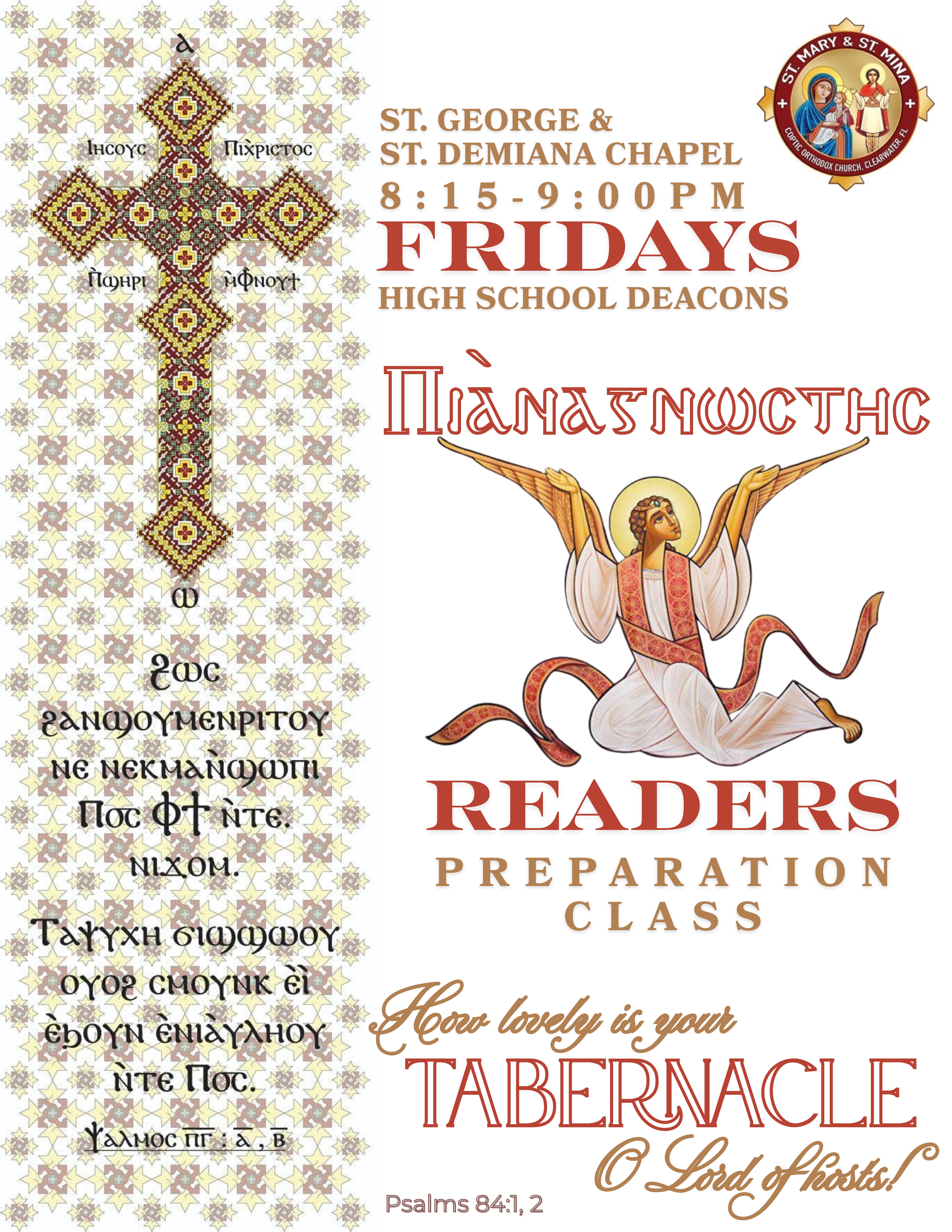 This class will prepare high school-aged young men to meet the criteria required to be elevated from the rank of Chanter (Pi`psaltic) to the rank of Reader (Pi`anagnwctyc).